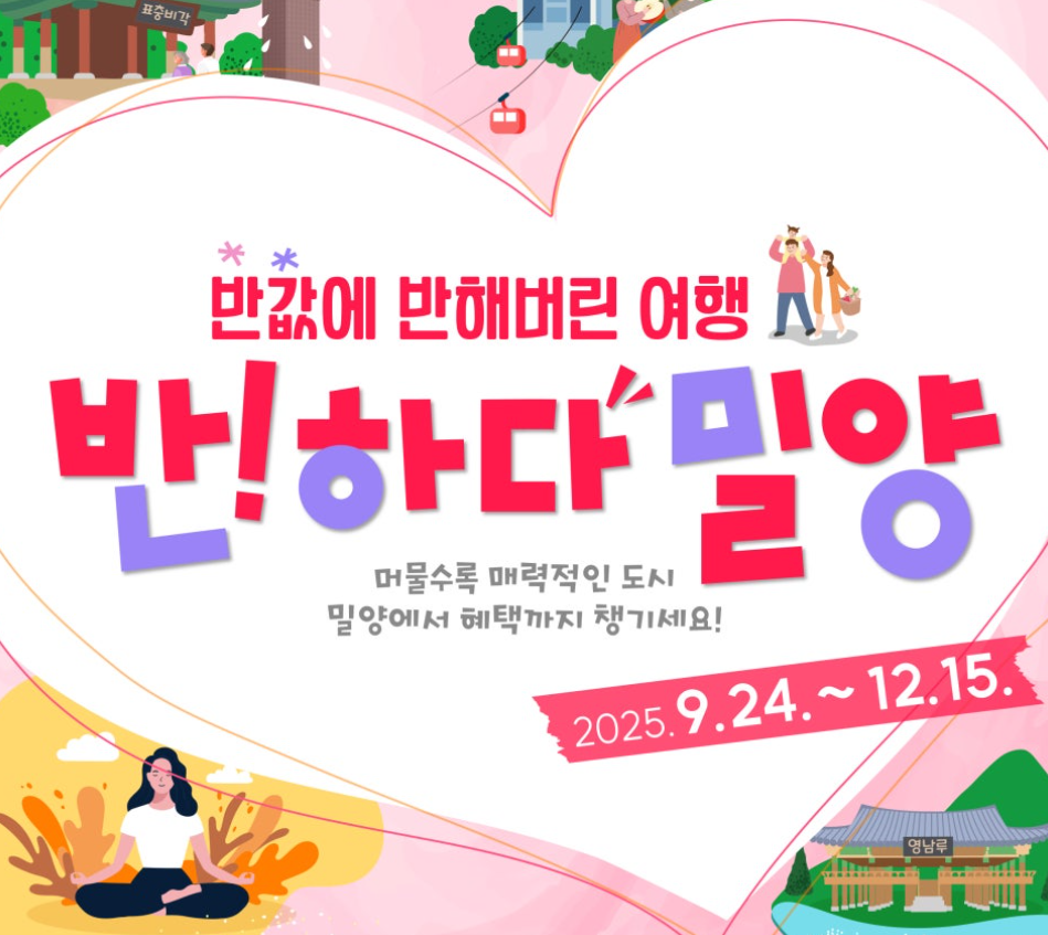 ‘반값여행’은 단순히 관광지를 빠르게 둘러보는 여행이 아니라, 밀양의 매력을 여유롭게 즐길 수 있는 체류형 여행 프로그램이에요. 숙박과 식사, 체험을 함께 즐기면서 지역경제에도 기여할 수 있는 기회입니다. 도시 밖 거주자라면 이번 기회에 부담 없이 밀양에서 힐링 여행을 즐겨보세요!