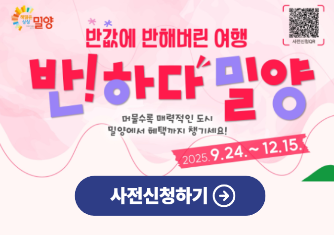 놓치면 후회합니다. 밀양 여행이 반값이라면 믿어지시나요? 숙박부터 체험, 관광까지 모두 절반 가격으로 즐길 수 있는 단 한 번의 기회입니다. 이미 신청자 폭주로 조기 마감되는 중이라 망설이면 끝입니다. 올가을, 밀양 반값여행으로 여행경비 절약해보세요!